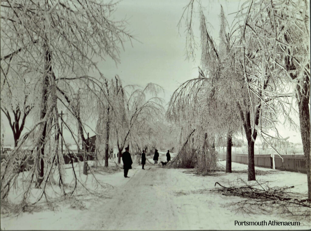 Meanwhile, three local newspapers offered colorful accounts of the event. Never in living memory, according to the Portsmouth Chronicle, had the trees been so coated with ice “from the ground to the tips of the smallest twigs” and hung with millions of tiny icicles as thick as pipe stems. Walking was almost impossible, according to the reporter, because both streets and sidewalks were “as slippery as greased glass.” For three full days the sound of branches crashing to the ground was heard in every corner of the city. One man, according to the Portsmouth Journal, experimented with a chunk of ice that weighed 40 ounces. When he melted away the water, the twig at the center weighed only a single ounce.