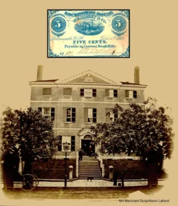 For 25 years, Lafond traveled extensively to record, not only the “scrip” notes, but the merchants who printed them. Here’s just one example of the paper notes. It wasn’t counterfeit because it didn’t pretend to be legal tender, and functioned more like an IOU from the vendor to the customer. This is note number 157 issued on Dec. 1, 1862, by J.M. Hadley & Company that operated the Rockingham House on State Street in Portsmouth. It was worth a nickel. But that nickel in 1862 would be worth more than a dollar today.