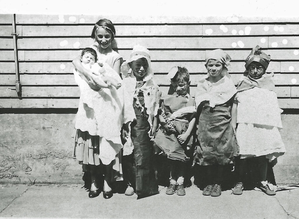 The contrast couldn’t be sharper between these tattered Depression-era children and the modern Portsmouth Halloween Parade. These five (six counting the baby) North End kids remind us us of an era when an apple or a stick of gum was a holiday treat. Almost a century later, Halloween has become a full-blown commercial extravaganza, as much for adults as children. No Spirit Halloween Superstore with racks of bloody severed arms, packaged costumes, and scary animated figures. No hoardes of well-rehearsed zombies daning through the street to Michael Jackson’s “Thriller.”