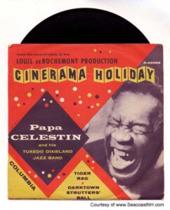 My strange collection of De Rochemont ephemera includes this 45 rpm recording of New Orleans musician Oscar “Papa” Celestin and his Tuxedo Dixieland Jazz Band playing “Tiger Rag” and “Darktown Strutter’s Ball.” This was a spin-off single from Cinerama Holiday, a risky but briefly successful 1955 foray into the world of super widescreen movies. I saw two cinerama films as a kid in the 1960s: Circus World and Grand Prix, both shown in 70mm on a single wide screen. The experimental Cinerama Holiday was shot on three cameras, shown simultaneously on three 35mm screens for a 146-degree effect. De Rochemont made one more film, Windjammer (1957), using a short-lived system called Cinemiracle. That documentary follows the 17,500-nautical-mile journey of a tall ship.