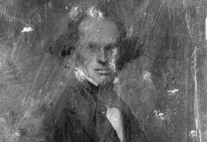 Detail of a widely circulated daguerreotype of Nathaniel Hawthorne from 1848, four years before his trip to the Isles of Shoals. The image appears to be a copy of a photo in the collection of the Peabody Essex Museum (Picryl.org)