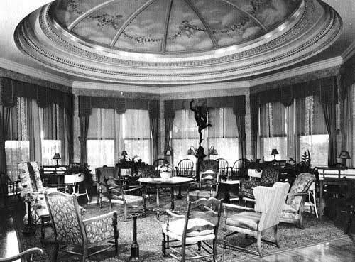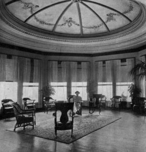 The ornate dome in the dining room is among the few original interior elements. An early brochure shows figures gathered beneath the dome in what was originally a males-only lounge. Decades later, the room was jammed with fancy imported furniture. A haunting publicity photo depicts a lone, fashionable woman in a neatly appointed open space.