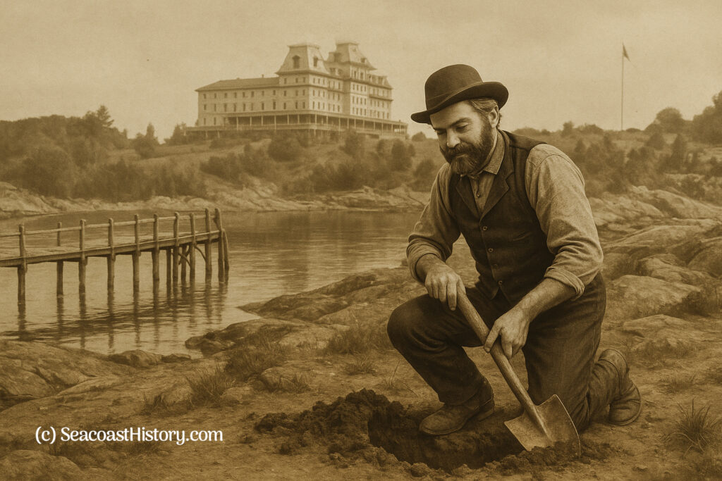 Thanks to the efforts of the Reference Desk at the Portsmouth Public Library, the author has learned that A. J. Griffin was Dr. Alvah J. Griffin, a physician practicing in Melrose, Mass. in 1885. Unfortunately, that doesn’t give a clue as to where he was able to get the funding for such extended searches of the mucky bottom at Little Harbor. And that leads to a befuddling question: Given that the crew who stole the minister’s money wanted a handy repository for the same, would such people plant it where the tide ebbs and flows twice in 24 hours? It would seem more rational for the treasure to have been buried on the beach between the bridge and Campbell’s cottage.