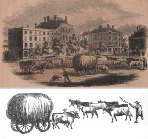 Early copies of the illustration were hand-colored, but do not reproduce well. I scanned this image directly from an original copy of Gleason’s, yet the dark aging, textured paper, and tight engraving lines tend to muddy the details. With an hour of amateur Photoshopping, I managed to pull out sample details of a hay wagon and a team of cattle heading to market.