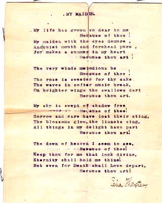 Celia’s typed manuscript for the poem “The Maiden” appeared for sale on eBay. The typed poem, was later revised and published as “Because of Thee.” The poem was edited by her fellow Seacoast poet, Sarah Orne Jewett, and re-published in 1896, four years after Celia’s early death. .