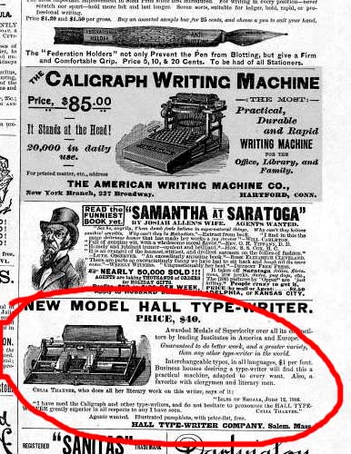 New England writer Celia Laighton Thaxter was among the pioneers of these new labor saving devices. Her endorsement of the latest Hall Type-Writer appeared in this November 19, 1887 edition of Harper’s Weekly. Considered a “a favorite with clergymen and literary men,” this machine, manufactured in nearby Salem, MA, sold for $40 (about $800 in modern money), fully half to one-third of competing machines. An even cheaper version, the Edison Mimeograph Typewriter, sold for half the price, under $25.