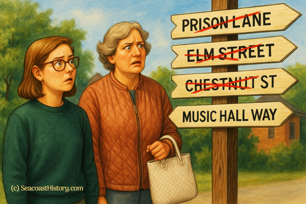 Street names can be rich with local history. The Atlantic Heights neighborhood, for instance, was created in 1919 as affordable housing for shipyard workers. Its streets – Kearsage, Concord, Porpoise, Crescent, Raleigh, Ranger, Falkland, etc. – are all named for Portsmouth-built ships. But just as often, names come from uninspired lists found in towns across the nation, carved out alphabetically for trees – Ash, Beech, Chestnut – or for presidents, flowers, or birds.
