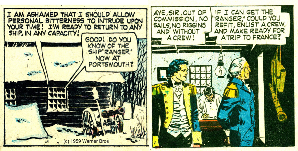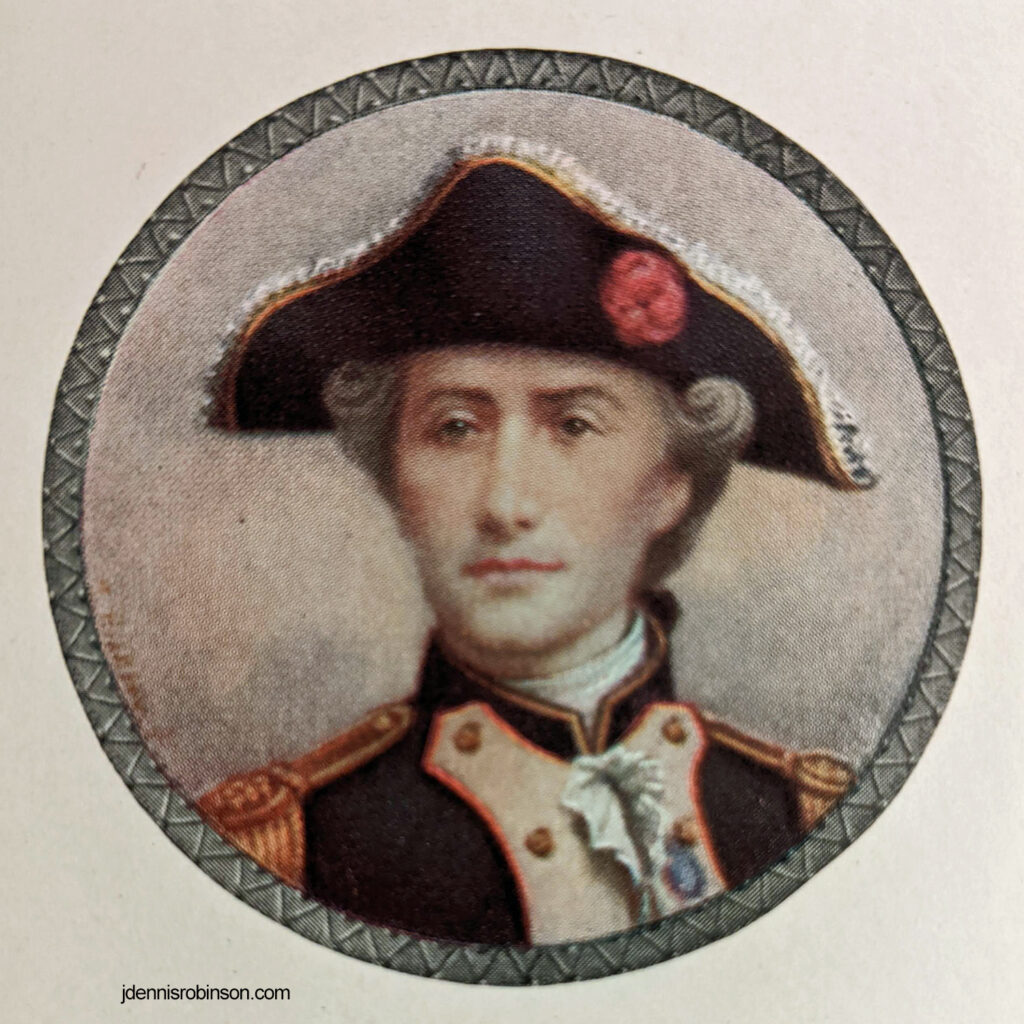The stuff for sale on eBay tells another tale. Hundreds of bits of “Jonesiana” indicate a maritime hero loved by a grateful and admiring nation. If he was not loved in person, at least he was loved in spirit. Inevitably, John Paul Jones appears in his red, gold, and blue uniform – a uniform he personally designed. Inevitably, there is a flag nearby. By a twist of fate, Jones was commissioned to captain the RANGER on the same day that the Continental Congress announced the design of the first American flag.
