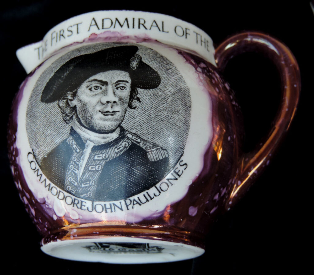 A 100-year old cream pitcher with Jones’ portrait, for example, reads: “The First Admiral of the American Navy.” But Jones was never an Admiral in America, only a Captain, a fact that made him hopping mad. And during his brief service to this nation, a service for which he was never fully paid, there was, technically, no United States Navy. When it comes to souvenirs, you can’t even trust a cream pitcher.