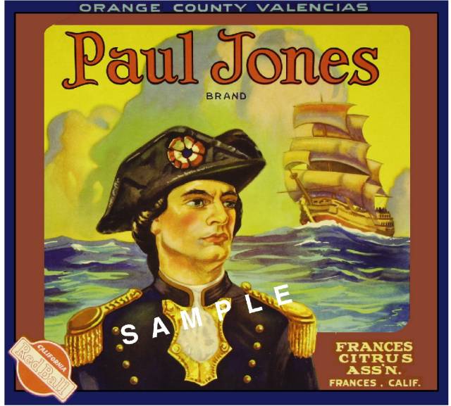 Because he died young and left no heirs, the life of John Paul Jones has become a blank canvas, copyright-free, for anyone who wished to exploit his name. British mothers once frightened their children into bed with threats that the pirate Jones would carve them up. Although he did not smoke tobacco or drink alcohol, Paul Jones brand cigarette, cigar, and whiskey ads were prominently displayed in the 19th and 20th centuries. A tobacco tin with his picture is worth $700 in today’s antique market. My collection includes a catalog of Paul Jones “middie” sailor blouses for women, labels for John Paul Jones brand oranges, apples and potatoes. I have a Jones doll and a Jones mechanical coin bank that fires pennies from a cannon. He has appeared on milk bottles, on Sugar Smacks cereal, as a Halloween costume, in plays, musicals and comic operettas.