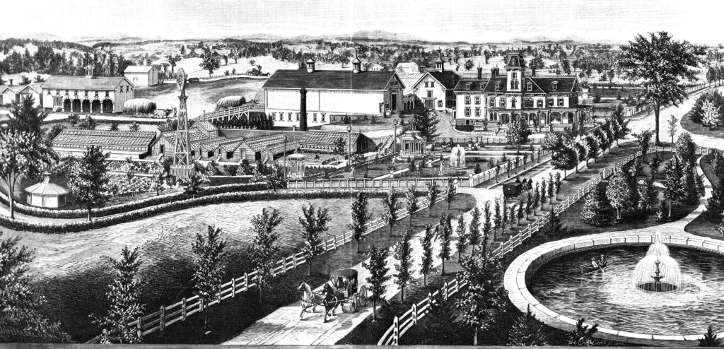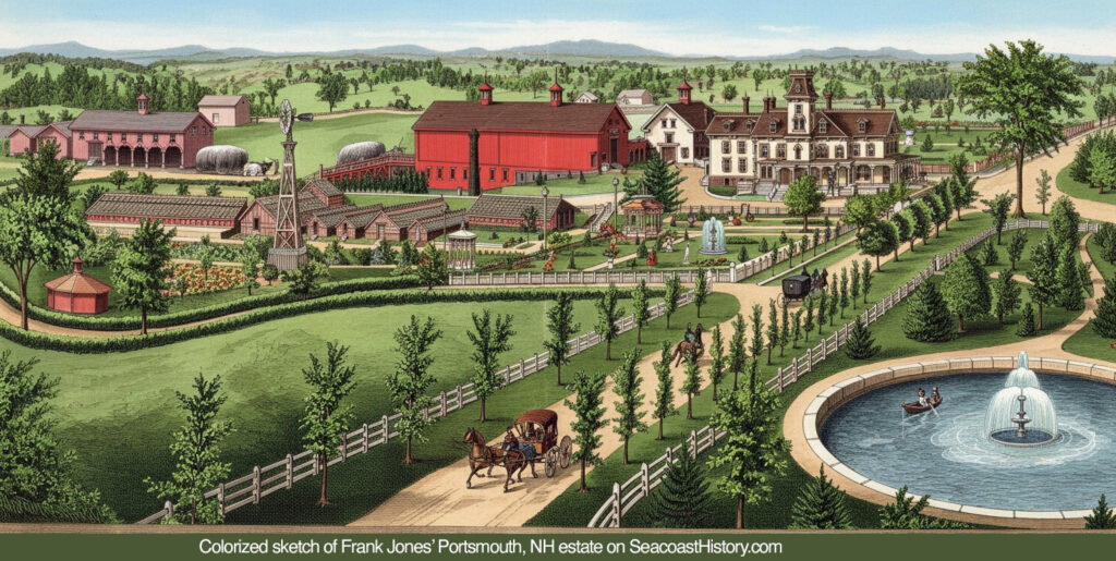 Digitally enhanced 1882 engraving of the 2,000-acre Frank Jones estate and farm on Woodbury Avenue in Portsmouth, NH.