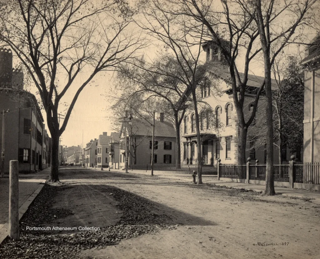 Nobody is suggesting we return to those thrilling days of yesteryear. Times change and cities evolve. But here’s a shot from the late 1800s to consider as we change again. By then, Daniel Street had become a tree-lined urban residential neighborhood leading from the river to Market Square. The brick Graffort High School on the right (later City Hall and now office suites) still stands next to the super historic 1715 Warner House museum.