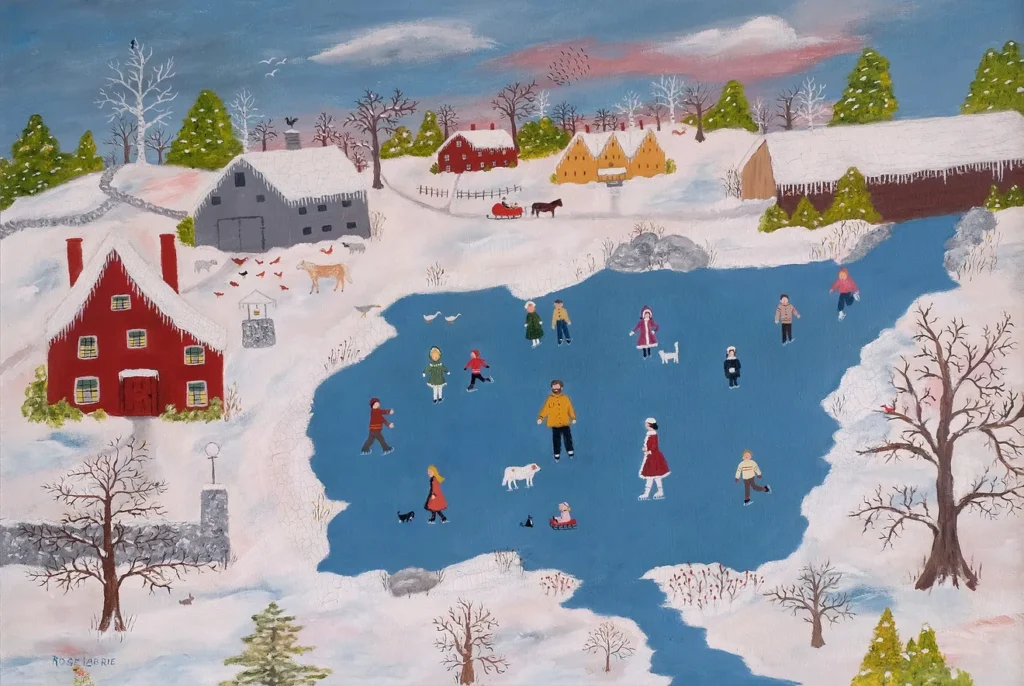 Labrie was born in 1916 to a mother from Nova Scotia and a father from Ireland. She grew up on a 240-acre Vermont farm. The vivid colorful landscape of pastures, mountains, and forests dotted with animals, she later wrote, “had every influence on my becoming a primitive painter half a century later.” The deep white snow, brilliant blue sky, yellow pastures, and green trees became the vivid backdrop to her work. She filled the landscape of her “memory paintings” with horse drawn sleighs, boxy two-dimensional houses, and doll-like figures.