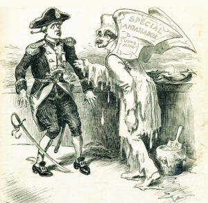 In the cartoon, the Acting Secretary is wearing a pair of strap-on angel wings. He has been coated in white paint from a can labeled “T.R. White Wash.” Confronted by the haunting figure of Loomis, John Paul Jones drops his sword. “My nerves are not what they used to be,” Jones is saying to Loomis.