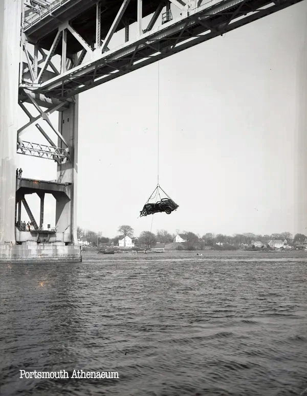 In 1949, a woman drove through the gate and into the swirling Piscataqua River. Archived photos show the gruesome recovery. The car, hooked to an underwater cable, was pulled from the river by raising the lift span. A barge then delivered the car to the Navy Yard with the drowned victim still in the driver’s seat.