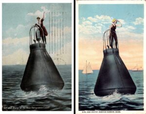 Note that the artist swapped models and backgrounds. The waves splashing onto the giant metal buoy are clearly painted in. The image is likely assembled from a photograph shot on dry land, then cut-and-pasted, airbrushed, and colorized. The one I have wasn’t mailed until 1914, so this image likely had a long, profitable run.