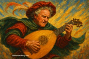 Reid traces his troubadour roots to history’s first “self-accompanied solo singers.” He finds himself wandering the villages of Italy as a lute player in the 1500s. He imagines a kinship with an Appalachian banjo artist, an Hawaiian singer with a ukelele, the African kora player, a Celtic balladier, a singing cowboy, and a Delta bluesman.