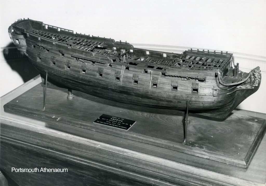 “I think it’s unique, absolutely unique,” says Rob Napier of Newburyport. He is talking about the wooden ship model of HMS America on display in the Reading Room of the Portsmouth Athenaeum.