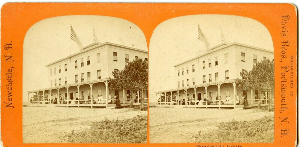 Mr. Chase, while sojourning on the island last summer, was struck with the beauties of the southwest section of the town bordering upon Little Harbor, and foresaw, with a sagacity that has characterized his former business operations, its capacity for a spacious and commodious retreat for summer visitors. He accordingly purchased about forty acres of land, including the site of the hotel, the construction of which he began last season, and hardly had the preparations for building commenced, ere every one wondered that it was not done years before. The new hotel is called “the Wentworth.” It is a well-built and admirably planned house, constructed under Mr. Chase’s supervision by a master builder from Somerville, Mass., with an extensive hall and office, large general parlor, reading room, reception room, &c., on the first floor, with a cheerful and well-lighted dining room capable of seating 400 guests. Around three sides of the house is a piazza fourteen feet wide, allowing guests even in an easterly storm, a comfortable spot under shelter to watch the “ramp and roar/Of wild waves dashing on the shore.”