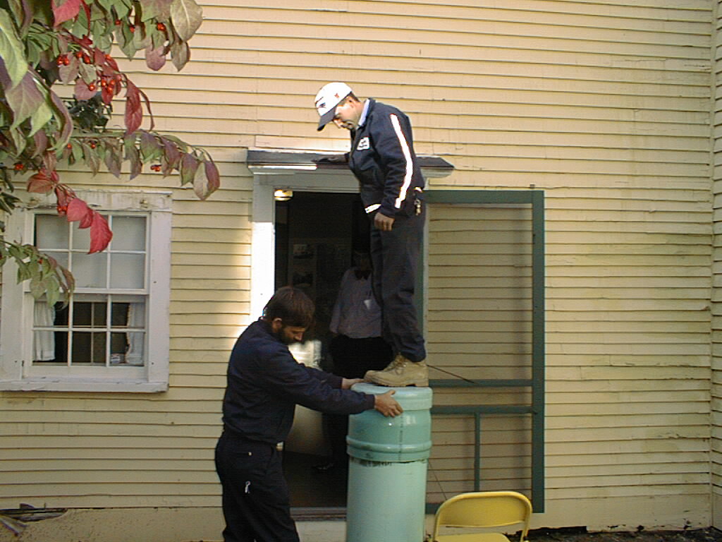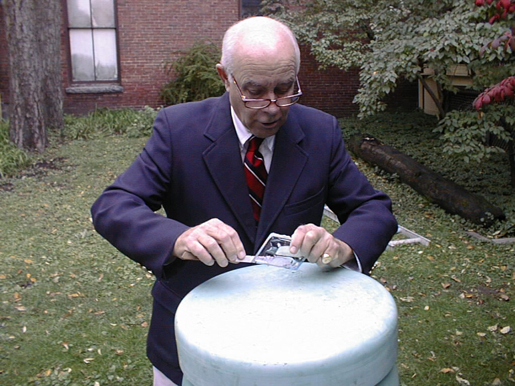 As the dedication ceremony loomed, society members screwed on the airtight cap – or tried – but it would not close. Two men from Public Works held the capsule upright against the side of the historic John Paul Jones House. Then two more city workers stepped from a yellow folding chair onto the capsule and began jumping up and down. It still would not shut. In desperation, workers drilled a tiny hole in the cap to release air, then called in city backhoe No. 59. The backhoe bucket pressed down on the capsule until, with a lout “pop”, the rubber seal locked on. Society trustee “Jock” Brodie, dressed in his suit and tie, picked up a tube of plastic cement at Peavey’s Hardware and filled-in the air hole. Perhaps moisture has leaked into the opening and the contents of the capsule, even now, are turning to mush. You and I will never know.