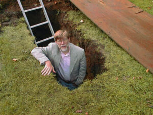 But such thoughts are best left to fortune tellers. We historians can only look backwards. Thankfully, my memory of those pre-9/11 days are still clear. The October chill was just kicking in. In the days before the capsule was buried, I frequently climbed down into the hole in the ground looking for artifacts. I found chips of discarded pottery, animal bones, the leg of an iron kettle, bits of glass and broken silverware. When the newest trustee of the historic society saw me poking around in the hole like a grave robber, she took a photo, which I now pass on to you. .