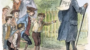 This image shows a group of boys taunting a local Tory by sticking a sign on his back. The illustration appeared in an 1879 book by Charles Carleton, “The Boys of 76.”