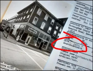Digging through my notes from April, I found the image shown here. I photographed this page from a 1970s government survey of buildings. At the time, the State Street Saloon building was occupied by a company called Keyfinders. I circled the estimated date of the building from the official report. The researchers then suggested 1870s. When I checked with a couple of prominent architectural historians, they agreed that 1870 was a more likely date, instead of 1850.