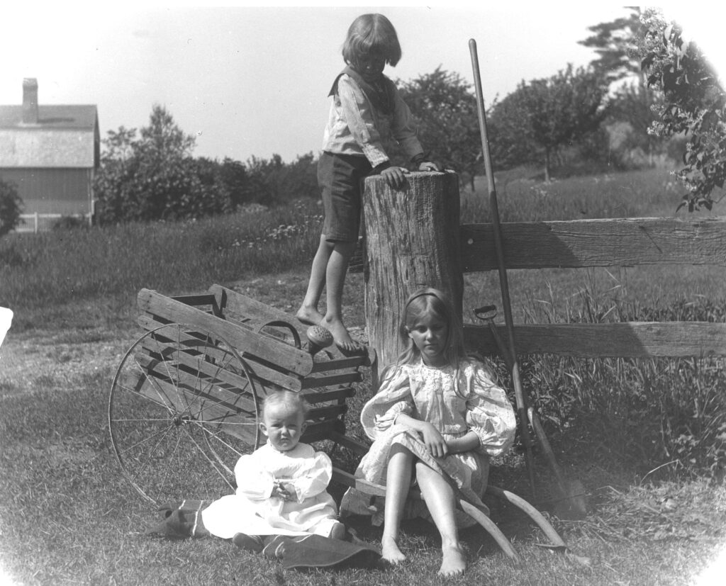 It is a fair bet that the old governor’s mansion was never livelier than when the Coolidge clan was in residence. Templeman and Katherine had five rambunctious children who were brought up steeped in the arts. The children spoke French, posed for their father’s paintings, and put on dramatic plays in the pine forest. Eldest daughter Molly, whose bedroom was once Gov. Wentworth’s dressing closet, rode her horse, swam in the creek, and traveled the grounds in a two-wheeled sulky pulled by Billy the Goat. Her early photographs show naked sprites (her sister and brother) posing in the woods and costumed princes and fairies.