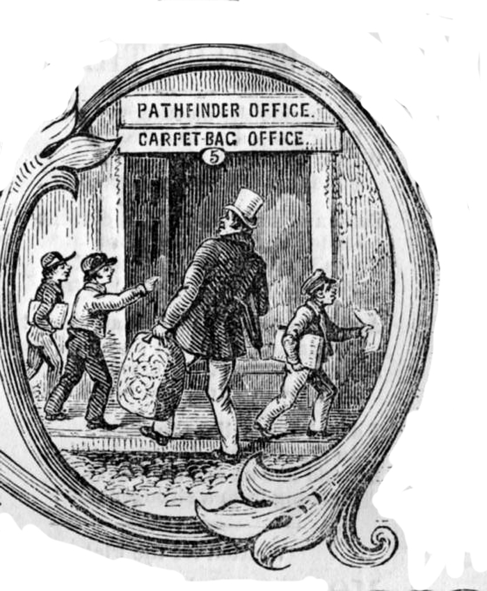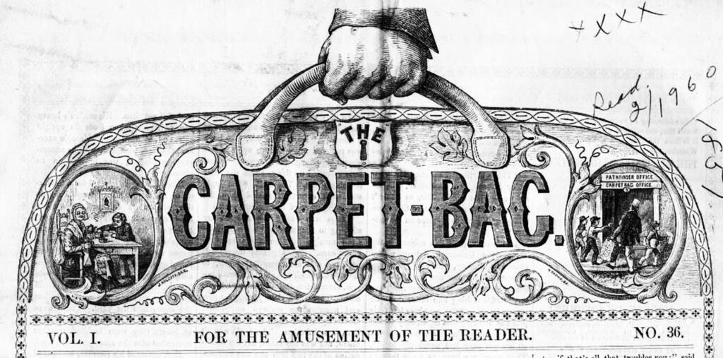 Copies are hard to come by, but hard to miss. The elaborately illustrated masthead shows a human hand grasping the leather handle of a fabric-covered bag, the all-purpose 19th century equivalent of a backpack. Today this cheap, floppy, flat-bottomed bit of luggage carries a negative connotation; it will be forever associated with the “carpetbaggers” who hurried to exploit the South after the Civil War. But to Shillaber’s earlier audience, a carpetbag was simply a place to keep all sorts of household stuff. His new publication, he explained, was to be the literary equivalent — stuffed to bursting with bits of prose and poetry that were just too precious to throw away.
