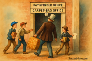 Shillaber had two Boston partners working in the second-floor office of the humor magazine that actually began as a railroad timetable broken up by funny bits, much in the spirit of Ben Franklin’s Poor Richard’s Almanac. The three owners printed many more copies than the 400 that sold weekly and soon the office was piled to the ceiling with back issues of the Carpet-Bag. The magazine hired a young compositor named Charles Browne from Maine who secretly contributed his first humor sketch to the Carpet-Bag and was thrilled to see it published. Under the pseudonym Artemus Ward, Browne later became one of the nations most popular humor writers.