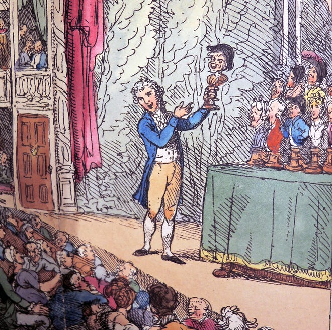 The “Lecture on Heads” was a comedic performance disguised as a moral and educational talk. In the London version, 50 paper mache heads representing different characters, some wearing hats and wigs, sat on a cloth-covered table. Employing props, songs, different voices and accents, an actor satirized each head – a preacher, an old maid, a judge, a quack doctor. The Portsmouth tavern lecture was likely a scaled-down version of the popular London show. But it was a breakthrough. Theater was creeping toward acceptance.