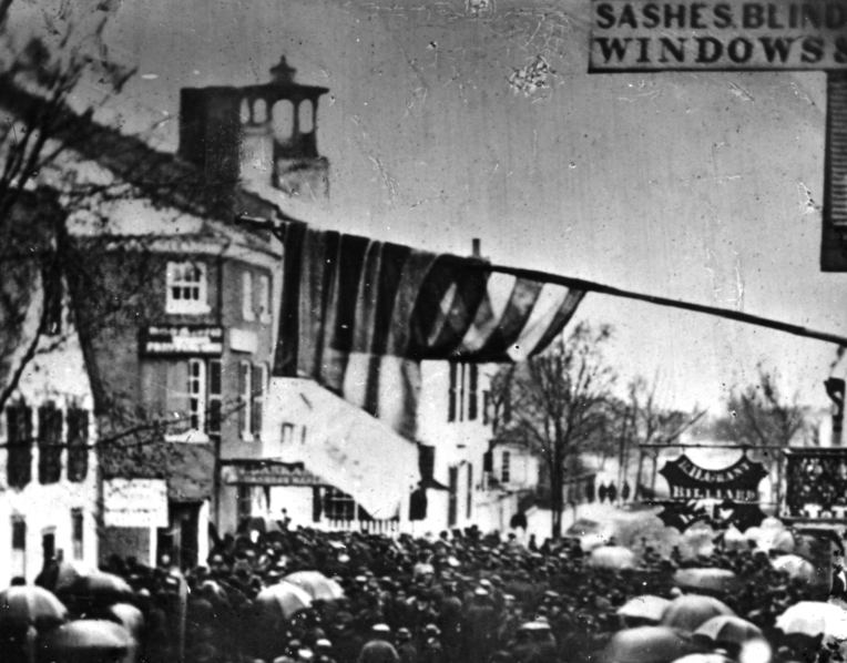 Someone got a flag, Foster said, and three men went through the roof “scuttle” in order to attach it to a wire above the office. The scuttle, a wooden trap door in the ceiling, broke off and fell to the street, hitting a bystander on the head and arm. This inflamed the crowd that began shouting for Foster’s life. Unsatisfied with the flag, the “mobocrats” insisted that Foster hold the flag himself and make a speech. He refused.