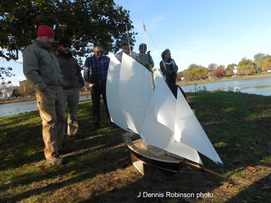 I wasn’t going to miss the launch of Little Lynx. It wasn’t quite as spectacular. Little Lynx is only a few feet long. There were not quite a dozen of us in attendance at South Mill Pond in Portsmouth for the maiden voyage. But the mini-schooner performed beautifully. She struck out like she was born to the waves–or ripples. I took a lot of photos to commemorate the moment.