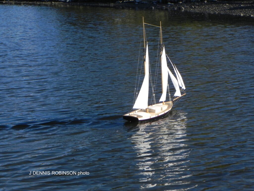 We couldn’t find a teeny-tiny champagne bottle and the brass band got held up in traffic, so modeler Alain Jousse handled the launch on his own. Alain timed the vent to coincide with the incoming tide, a wise decision, since, after two quick turns of the pond, Little Lynx got hung up on a sandbar. But a rising tide lifts all boats, and soon the radio-controlled privateer was again on the prowl for prizes. With no other ships in sight, after half an hour of successful trials, Little Lynx returned to the dock.