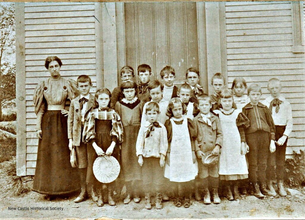 The second New Castle schoolhouse was a small two-story structure on the site of the current town post office. Built in 1823, it was here that Miss Maude reigned supreme among primary students (grades 1-4) for 51 years. Her dictum, according to Anna White, was “If you can’t say anything good, don’t say ONE WORD!” In the early 1900s, Maude Trefethen was paid $13 per week or $185 for each term of 15 weeks.