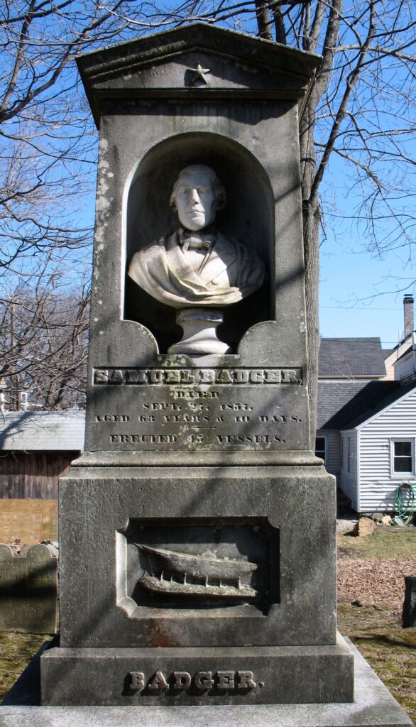 A rarely seen monument bearing a bust of shipbuilder Samuel Badger by sculptor David French is in Otis Cemetery (Badger Plot) in Kittery, Maine. The statue, located on private property, has been called “one of the most distinctive examples of funerary art in the United States.”