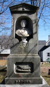 The monument is described as a “stepped rectangular granite shaft, set on a granite foundation.” It is really a fancy tombstone that includes a marble bust of Samuel Badger (1794-1857) set into a curved alcove. Below the grave figure is a bas-relief image of a tall ship under construction, very similar to the one depicted on the New Hampshire state seal, only without the masts and rising sun.