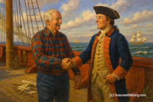 Now Melbourne Smith wants to build another Ranger and do the same for Portsmouth. He’s heard that some of us are bandying the idea about, and he’s come all the way from Annapolis to verify the rumor. Tom Cocchiaro of the local chamber of commerce, the man who revived the “rebuild the Ranger” concept is with us in the frigid parlor.