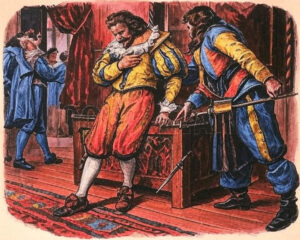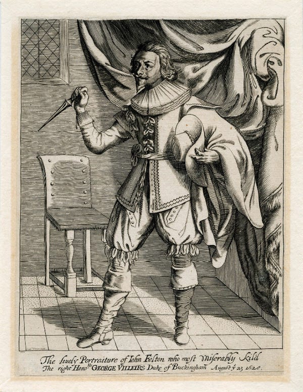 Enter John Felton, an army officer who, for both personal and political reasons, believed England would be better off without the pompous, duplicitous George Villiers. Felton attacked the Duke in a dark hallway by a crowded parlor in Mason’s home. According to a witness, Buckingham fell, then jumped up shouting “Villain!” He appeared ready to chase Felton, then dropped down dead.