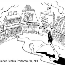 This particular cartoon depicts a real event for which I still plead innocent. Back, I believe, in the 1970s, a friend and I wandered into a Portsmouth bar called the Night Owl. Bars were, shall we say, different back then. It might have been a private club, but we knew the bartender. Nothing, as I recall, was going on. The place was dead. Someone, maybe me, put a dime in the jukebox, which was a little improvement.