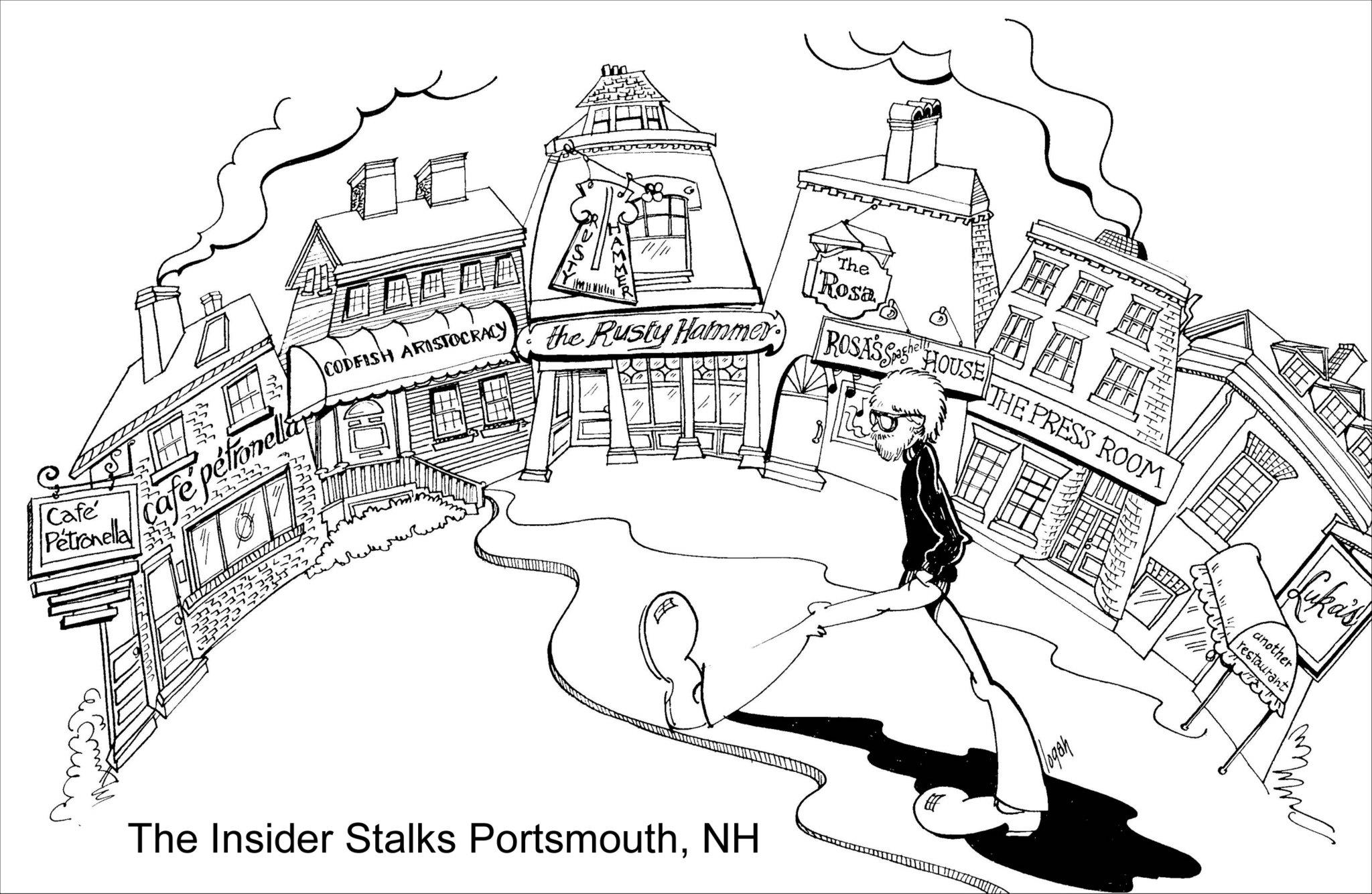 This particular cartoon depicts a real event for which I still plead innocent. Back, I believe, in the 1970s, a friend and I wandered into a Portsmouth bar called the Night Owl. Bars were, shall we say, different back then. It might have been a private club, but we knew the bartender. Nothing, as I recall, was going on. The place was dead. Someone, maybe me, put a dime in the jukebox, which was a little improvement.