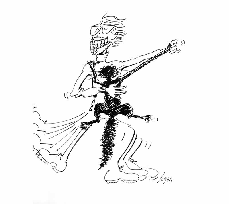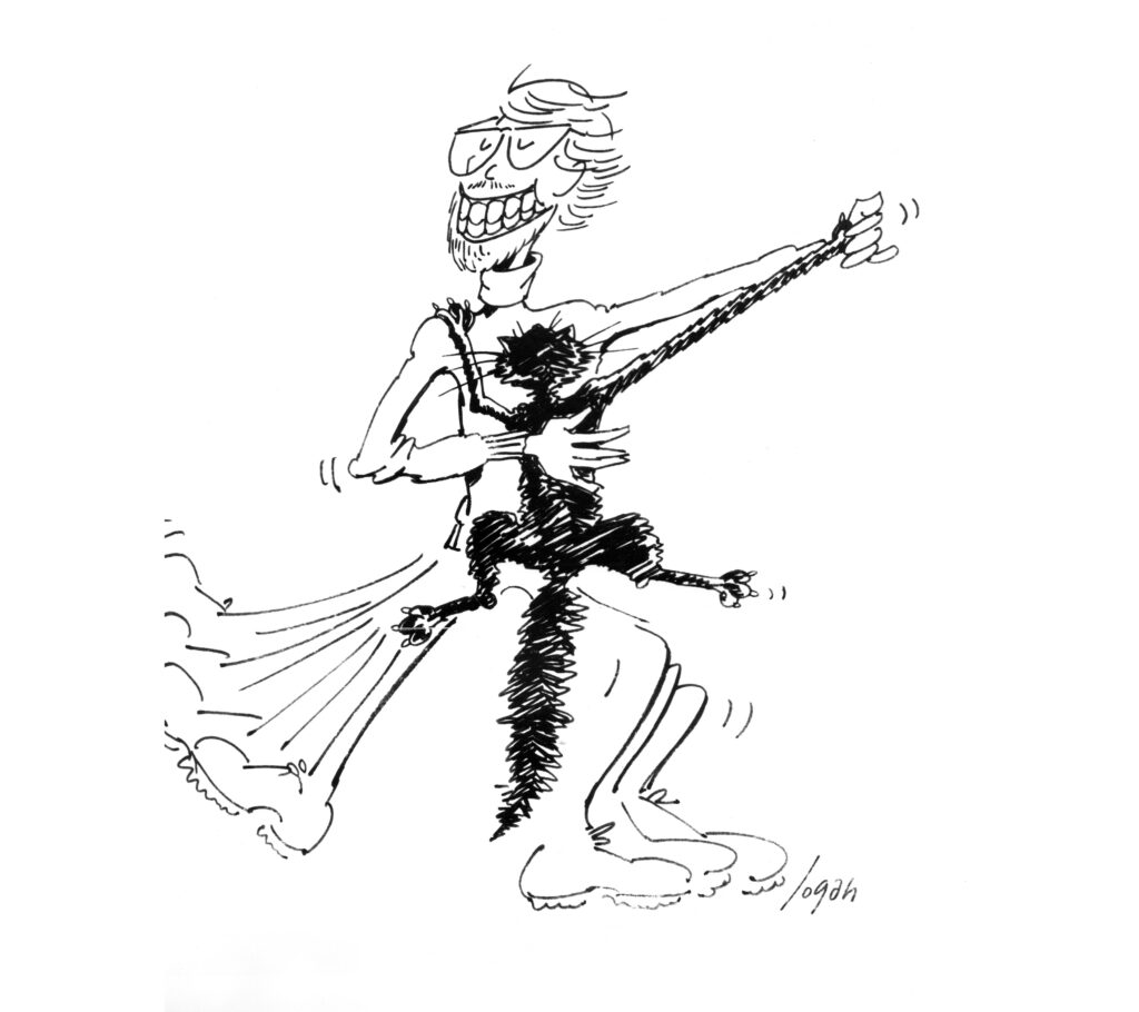 A huge cat was sitting on an unused pool table. It was as bored as we were. Ohimut of sheer whimsy, I picked him/her up and began waltzing around the empty saloon. Long story short, we got kicked out of the Night Owl. When I recalled the event in a local publication, now long gone, the staff cartoonist whipped off this illustration. I shrink to admit, it’s pretty darn accurate.