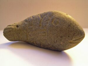 There are decades of clippings, letters, and printed emails pressed in plastic sleeves on my shelves – including this candid shot of the “mystery stone fish.” A reader picked up this carved effigy at a thrift shop and wanted to know what it is. Since Native Americans have lived along the Piscataqua for 12,000 years before me, I had to throw up my hands in defeat – and added this artifact photo to the blog file. I love this thing, but all we have is a blurry photo.