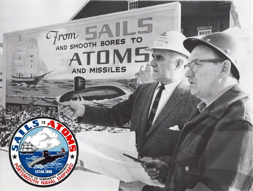 I selected this 1965 news photograph for the sign in the background. It shows a tall ship and a USS Albacore-shaped submarine passing Whaleback Light in Kittery. The painted mural was a larger version of the familiar red-white-and-blue “Sails to Atoms” logo of Portsmouth Naval Shipyard. This version reads “From SAILS and smooth Bores to ATOMS and Missiles. Hidden behind the arm of the man in the hardhat the text reads: “Established 1800. Dedicated to Submarine Progress.”