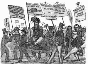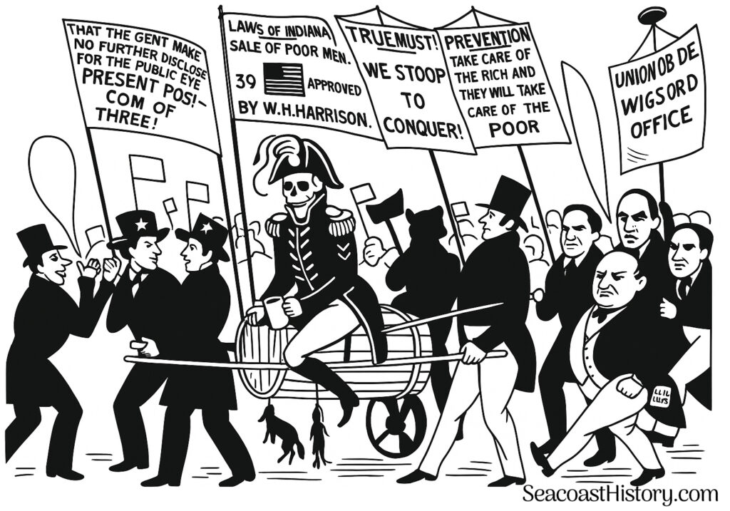 The copy of WHIP & SPUR given to me by a reader was delivered to a Portsmouth subscriber over 170 years ago. If you think the current presidential campaign is tough, you should read the newspapers back then. President Martin Van Buren had inherited a nation on the brink of financial disaster with high inflation and unemployment. The president, a Democrat, failed to take corrective action in the Panic of 1837 when 618 banks failed. Fearful of losing the White House, the Democrats depicted the Whigs as a drunken rabble (seen here) and suggested that Harrison would rather have a barrel of hard cider than be president. The attack backfired when the Whigs characterized their candidate as a homespun log cabin-type guy with whom voters could have a beer. Although he was not that guy, Harrison won the election. (One sign here reads: “Take care of the rich, and they will take care of the poor.”)