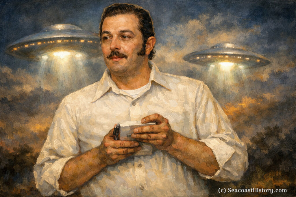MUSCARELLO: Now don’t put me on the line because I’m no professor of science, that’s for sure. All I can tell you about is what actually happened to me. And as in the book (Incident at Exeter), on September 3, 1965, on or about 2 am, I was thumbing down Route 50 towards Exeter, in Kensington near Mr. Dining’s farm. It was a clear night, no rain. There were plenty of stars in the sky. It was just a clear beautiful night. I’d been up there seeing a friend of mine. I’d missed a ride and I was thumbing back. No cars pick you up at that hour of the morning. I observed planes in the sky earlier. It’s pretty easy for me to understand the difference between a plane and what I saw. I’m sure if you experienced it, there wouldn’t be any question in mind. I got just past the Dining farm – There’s a little field on the right hand side. You can kind of see the glow of Hampton Beach and the lights from the beach, which is distinguishable. What I’m trying to say is that you can see what’s going on. It’s pretty obvious that that’s the beach area.