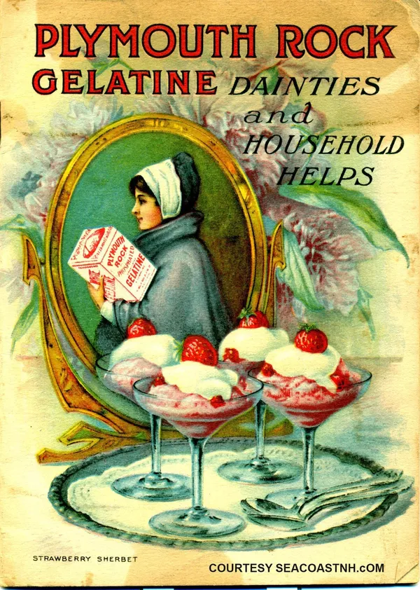Early ads for Plymouth Rock Gelatine show the Pilgrims enjoying cubes of the wiggly dessert treat. Historically, that’s possible. Gelatin has been around since at least the Middle Ages, but these days who has time to spend six hours boiling down cattle and pig hooves to get collagen? Among the enticing illustrations is what appears, at first, to be a curved gray blob. On closer examination, the picture shows – you guessed it – an edible version of Plymouth Rock emblazoned with the 1620 date.