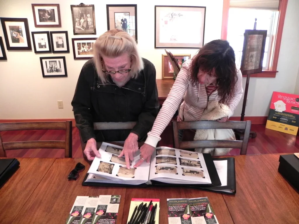The Founders Room at Fuller Gardens is tucked down a narrow private driveway behind the former stable and carriage house. Not surprisingly, the room is a shrine to the family’s history. Framed photographs line the walls surrounding a central table. Pamela Bottomley, Alvan and Viola’s granddaughter, has set out boxes of professionally archived images.