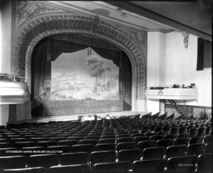 Opened in 1915, records indicate that the Olympia was suddenly the most profitable theater in town, offering both silent films and vaudeville acts. An electric sign at the corner of Vaughan and Congress streets pointed the way to the 998-seat theater. An early edition of “The American Organist” reported that Alexander Bilbruck was the organist at the Olympia in 1920, before “talkies” arrived. The organ is visible in the orchestra pit here. Decorative features include painted cherubs, American flags and a female figure with arms outstretched at the peak of the proscenium arch.