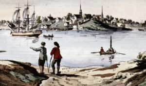 Sketched from the Kittery side of the Piscataqua River, the hand-colored engraving shows a flourishing, yet pastoral city, stretching along the waterfront. There are no bridges linking provincial New Hampshire to Maine, then part of the province of Massachusetts. Tall ships sail the harbor dotted with wharves and warehouses. Only a few buildings reach three stories and we can see the spires of three wooden churches: the original SouthChurch, NorthChurch, and Queen Ann’s Chapel.